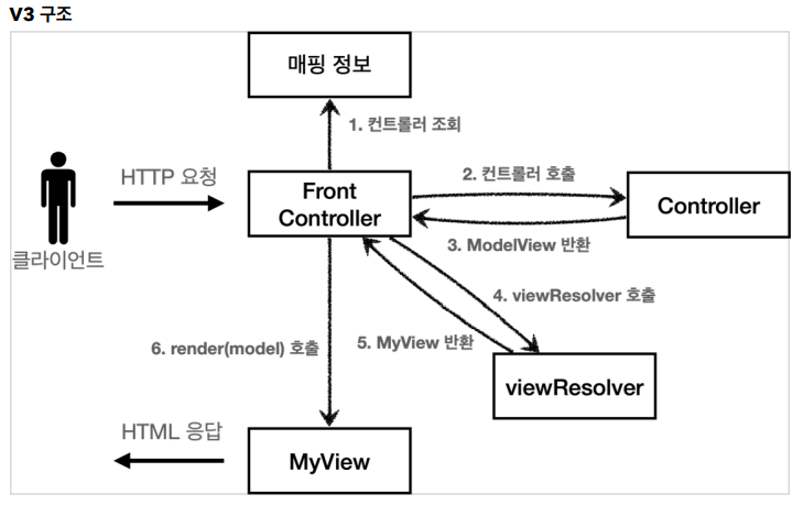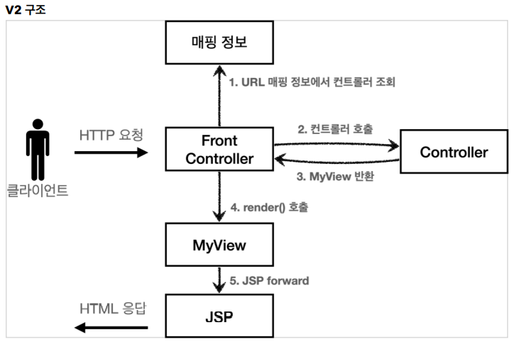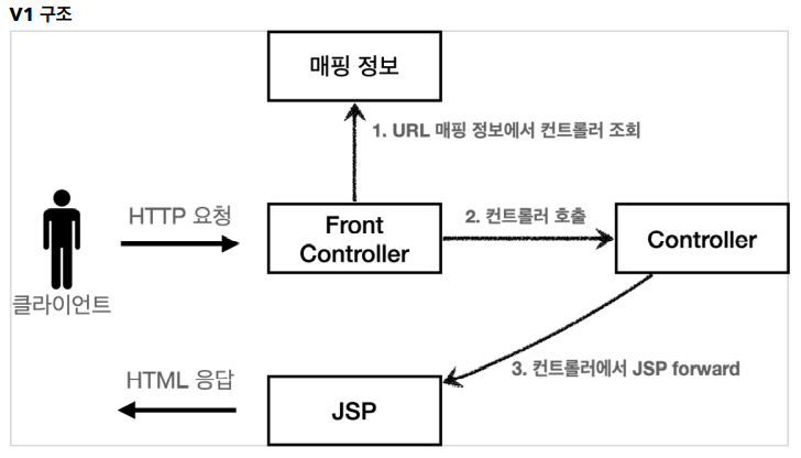 내부 로직은 기본 서블릿과 거의 같다. 아래 그림의 1, 2번 작업을 진행할 프론트 컨트롤러만 생겨났다.