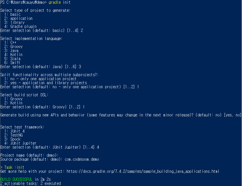 Gradle의 init 명령어로 프로젝트 시작이 가능하다. 원하는 위치에서 gradle init 명령어를 실행하면 된다.