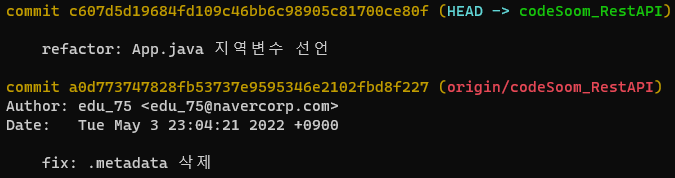 - WSL 을 일전에 사용했던 모양이다. commit 의 Author 가 네이버클라우드 에듀 계정으로 되어 있었다. 왜 들어가 있는건지 아직도 의문이다. 과거의 내가 뭔가를 했을 것 같다. 이런 상황에는 이렇게 하면(알아 보면) 되는 구나를 학습했고, 이 점 때문에 오늘 진행한 commit 중 가장 오래 기억에 남을 것 같다.