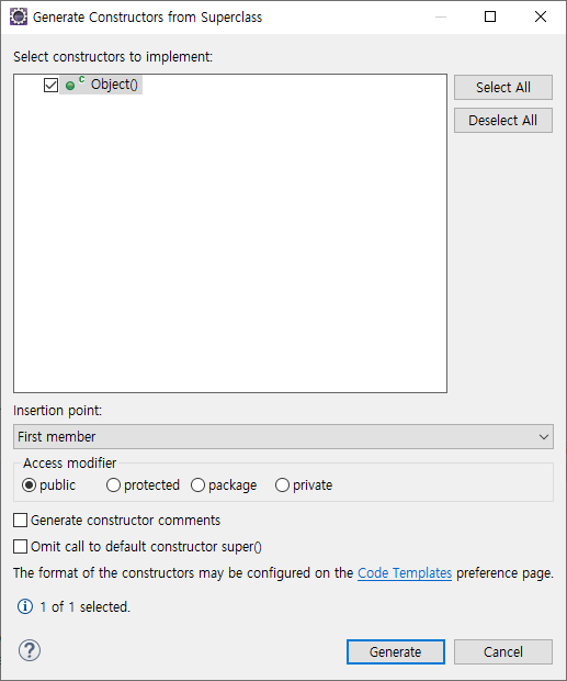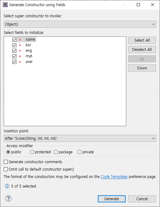이 과정이 귀찮으면 자동으로 설정할 수도 있다. (위에 있는 * eclipse에서 생성자 함수 자동 생성시키는 방법 참고)