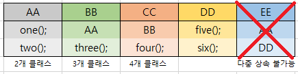 class EE extends AA, DD {}//다중상속 에러(c에서 가능) -> 방법 구현 가능