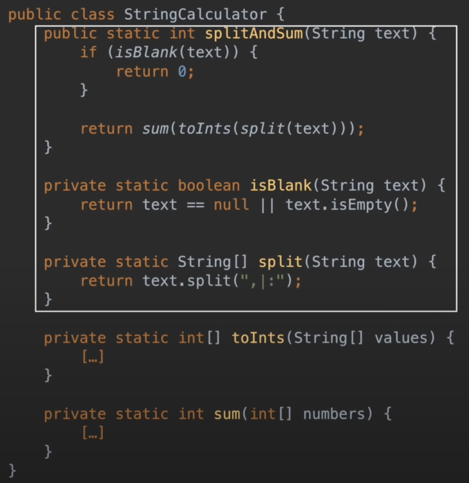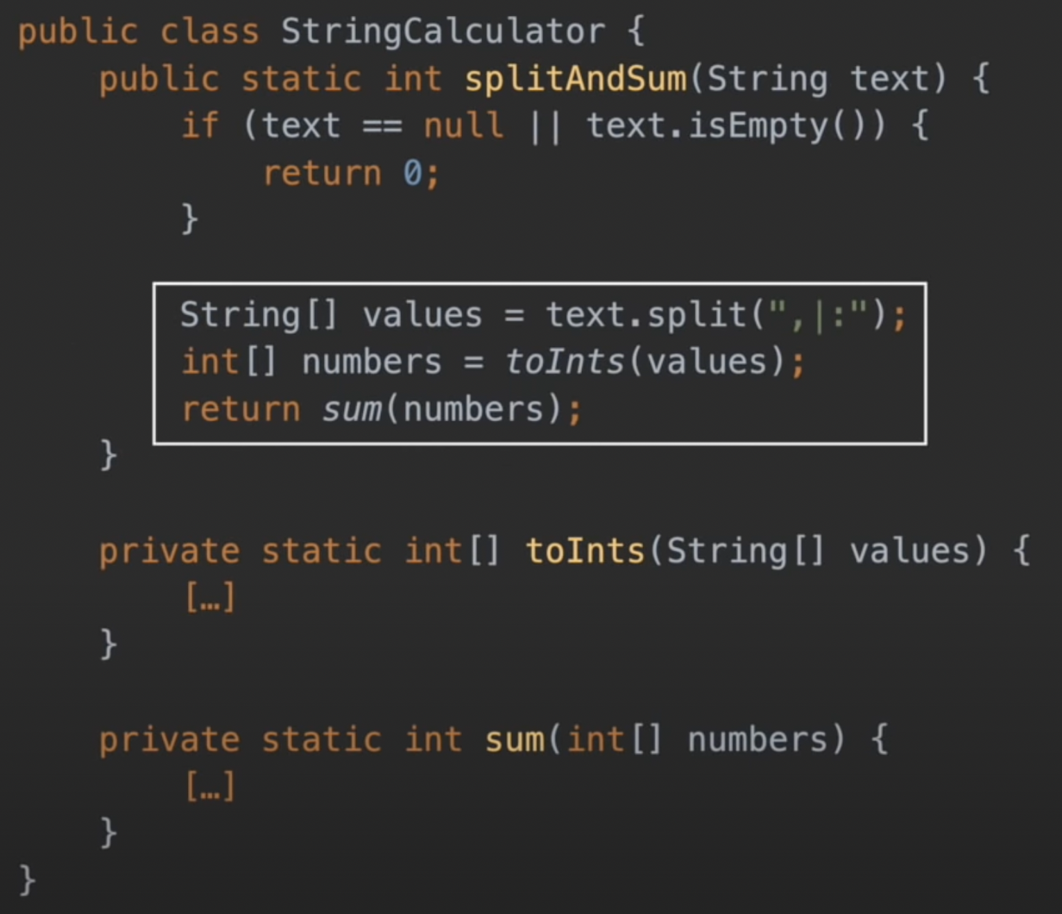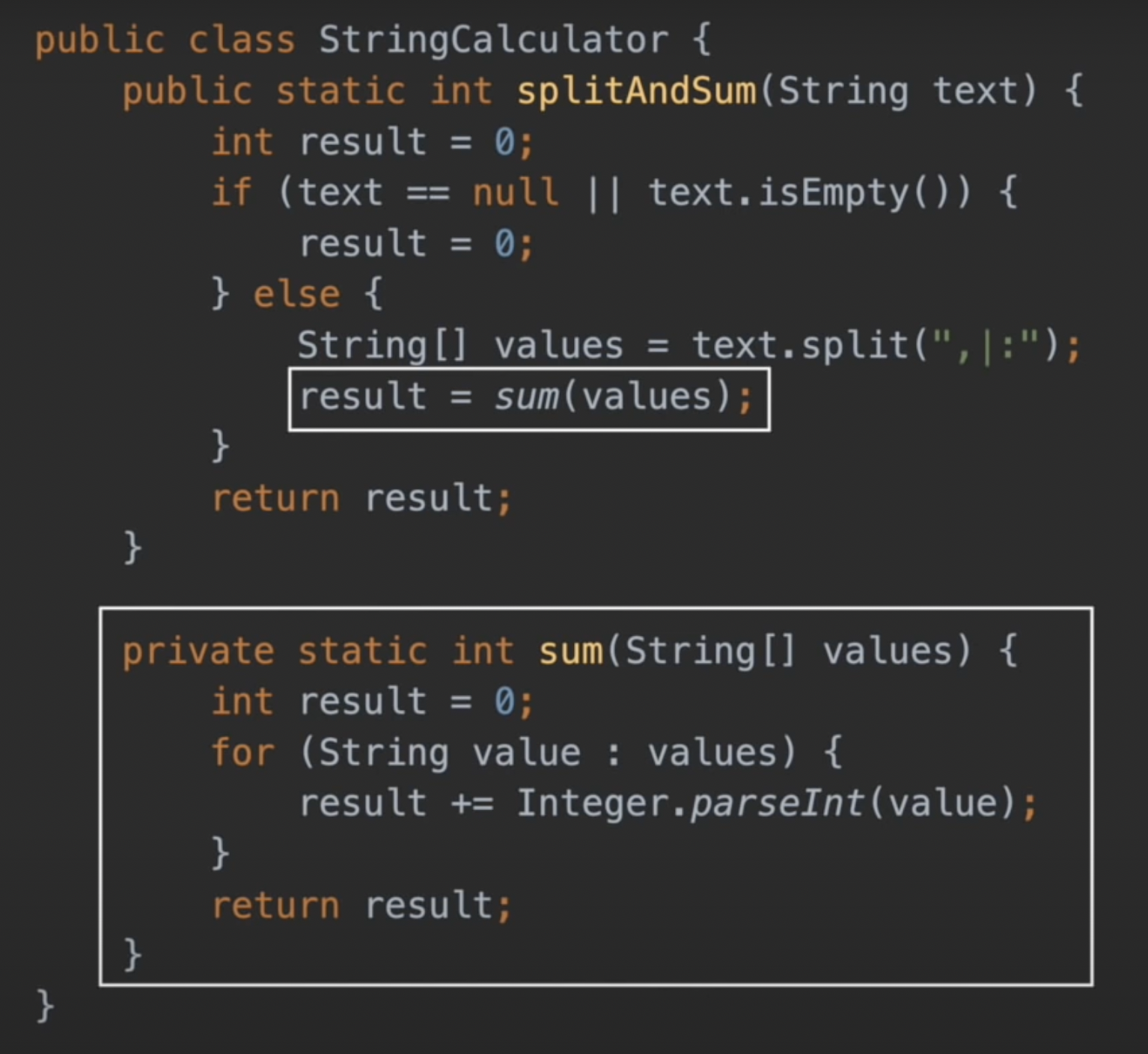 물론 이 경우에는 for문을 두 번 도는 구조가 되지만, 우리가 구현하는 대부분의 반복문은 데이터 크기가 크지 않기 때문에 프로그램 성능에 영향을 거의 주지 않는다. 그리고 이때 메서드가 한 가지 일만 하게 작성한다면 다시 재활용 될 수 있다.
