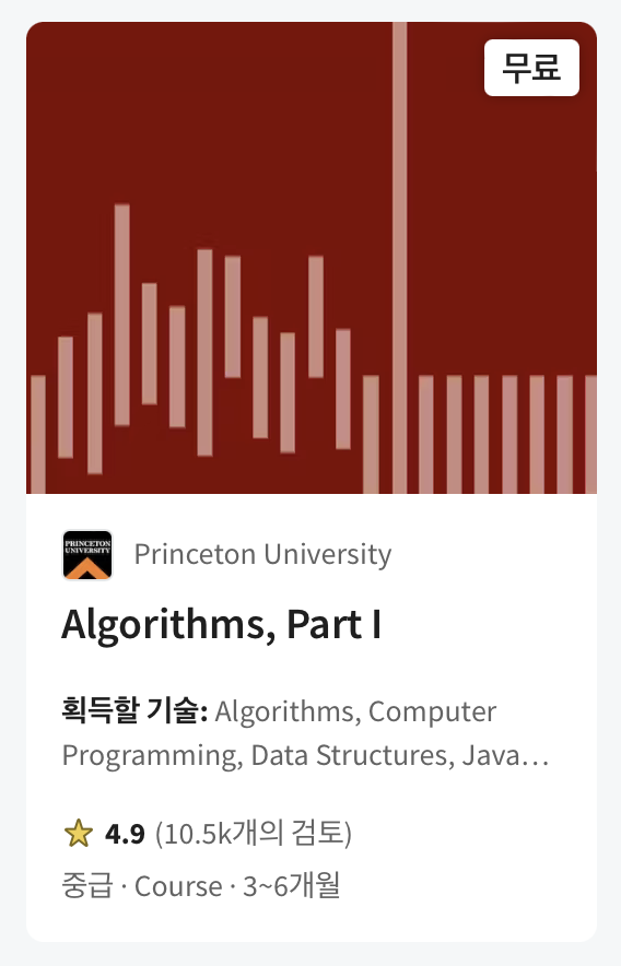 저번주 월요일에 Princeton 의 Algorithms, Part 1 과정을 마쳤다. 이 과정은 Coursera 에 있으며 과거(대략 2010년대로 추정)에 촬영한 영상을 온라인으로 수강 할 수 있다. 또한 이 강좌는 Robert Sedgewick 의 Algorithms 책의 내용을 두 부분으로 나누어 Part 1, Part 2 로 제공하고 있다. 강의를 수강하게 된 계기는 코드숨에서 시작한 알고리즘 스터디로 인해서였다. 스터디 시작 전에 해당 강의에 대한 이야기가 나왔는데 강의까지 들어두면 좋을 것 같아 시작하게 되었다.