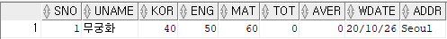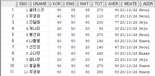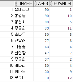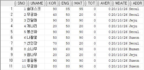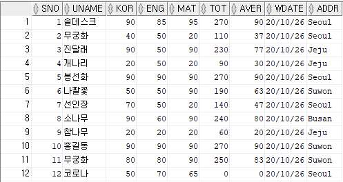 ※ tot, aver값이 0인 sno=12값이 추가되었음을 알 수 있다.
