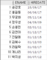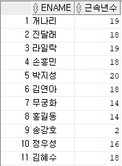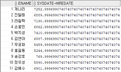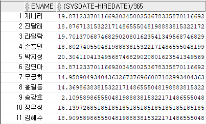※ where 조건절에서 (현재날짜 - 입사일)/365에서 소수점을 버린 모든 값과