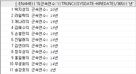 select ename || '의 근속연수: ' || trunc((sysdate - hiredate)/365) || '년'