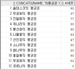 select concat(uname, '의 평균은 '), aver from sungjuk;