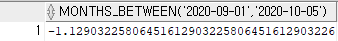 select months_between('2020-09-01', '2020-10-05') from dual;