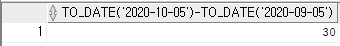 select to_date('2020-10-05')-to_date('2020-09-05') from dual;