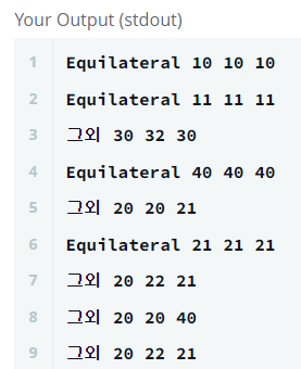 WHEN A=B OR A=C OR B=C THEN 'Isosceles'